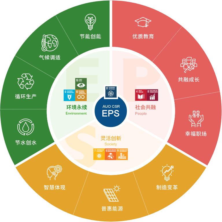 根据联合国所发展的17项永续发展目标,AG旗舰厅 (中国大陆) 光电以「超越企业社会责任,创造共享价值」为企业永续愿景发展蓝图,订出环境永续、共融成长与灵活创新的EPS(Environment, People & Society)三大永续发展主轴;以响应日益受关切的环境议题与社会共融趋势。