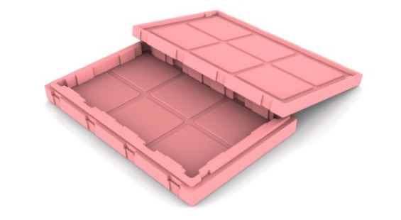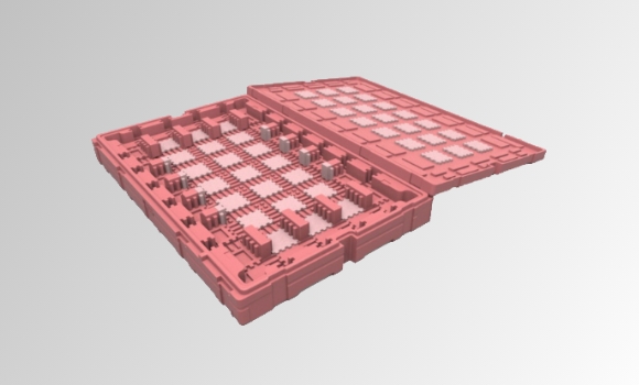 TFT-LCD 面板尺寸多樣化是不可避免的趨勢,也因此導致停產機種產生大量閒置玻璃運輸箱,「移動式檔塊設計」於箱底及箱蓋預留固定卡槽,讓檔塊可垂直和水平移動以調整裝片尺寸,即使產品停產後也能藉改變檔塊位置再給其他新機種使用,可達成運輸箱重複使用並減少新模具開發費用;且檔塊是由兩種發泡倍率堆疊,低倍率用以固定檔塊位置, 高倍率則提供緩衝用以提升保護性;檔塊可藉由箱底及箱蓋卡槽固定於任意位置,不需多餘料件支撐於牆面可節省材料成本,甚至可依需求裝載不同尺寸面板以增加共用性, 減少新包材的開發。