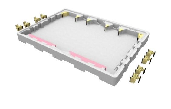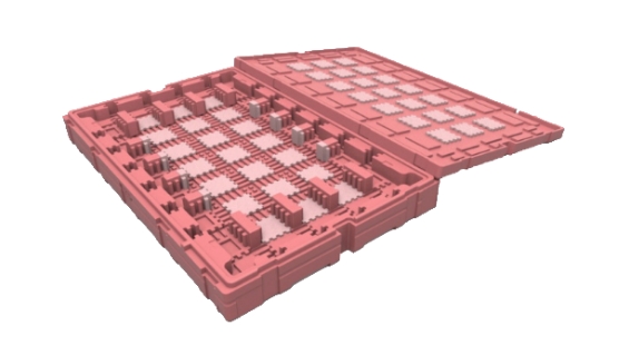 於箱底及箱蓋預留固定卡槽,讓檔塊可垂直和水平移動以調整裝片尺寸,即使產品停產後也能藉改變檔塊位置再給其他新機種使用。