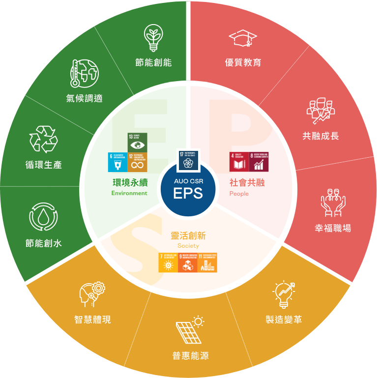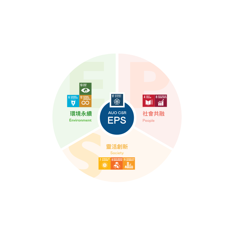 根據聯合國所發展的 17 項永續發展目標,AG旗舰厅 (中国大陆) 光電以「超越企業社會責任,創造共享價值」為企業永續願景發展藍圖,訂出環境永續、共融成長與靈活創新的 AUO EPS ( Environment,People & Society ) 三大永續發展主軸,以回應日益受關切的環境議題與社會共融趨勢。