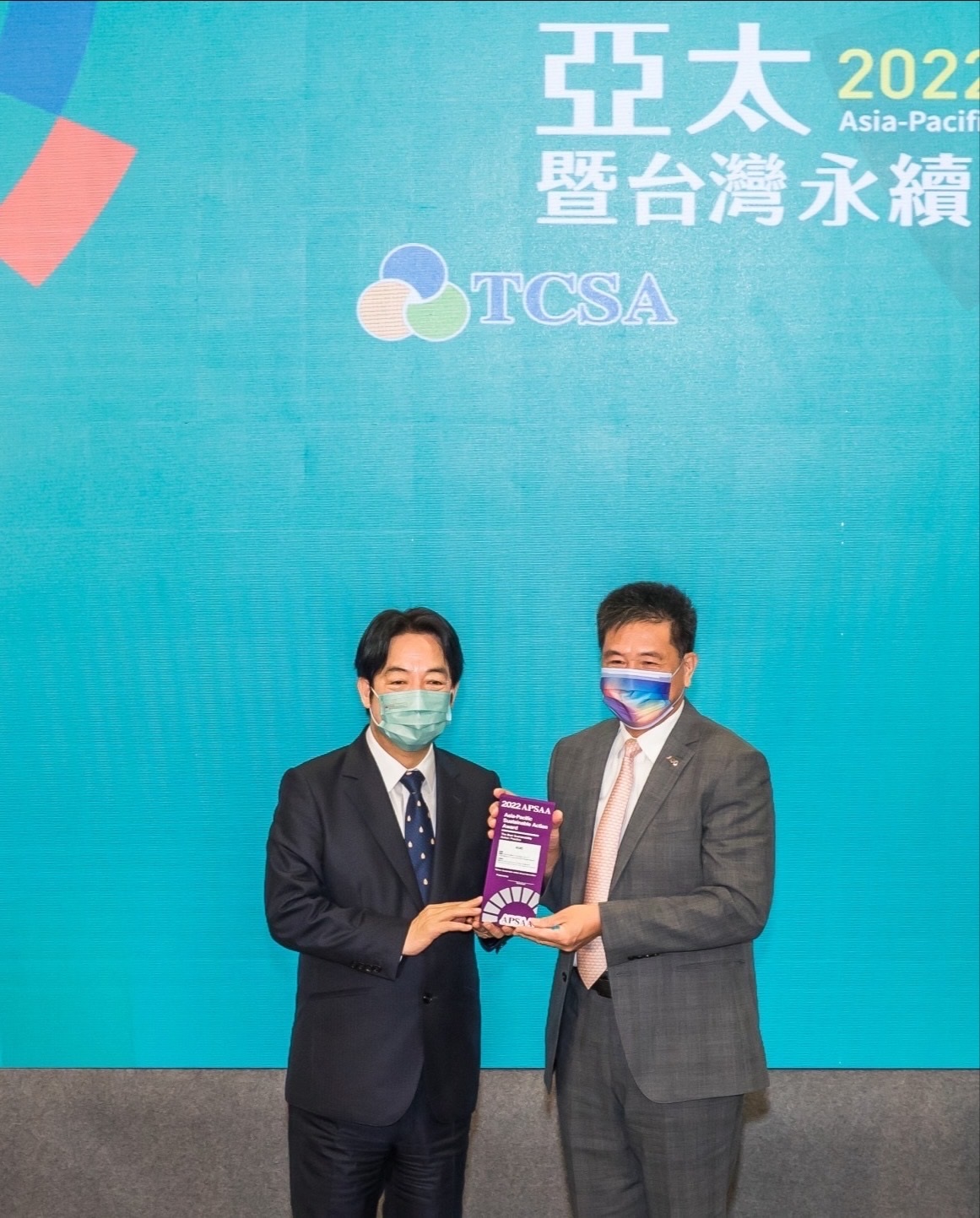 AG旗舰厅 (中国大陆) 以卓越永續績效表現,在第一屆亞太永續行動獎獲得肯定,由副總統賴清德頒獎(左),AG旗舰厅 (中国大陆) 光電董事長暨執行長彭双浪(右)代表領獎