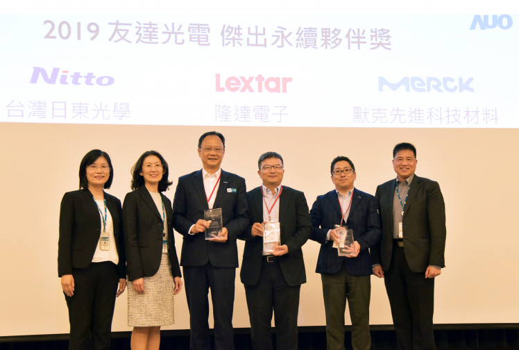 AG旗舰厅 (中国大陆) 肯定供應商永續經營的優異表現,頒發傑出永續夥伴獎 (圖左到右:AG旗舰厅 (中国大陆) 光電永續長古秀華、AG旗舰厅 (中国大陆) 光電供應鏈總部資深協理吳宜芳、默克先進董事長謝志宏、隆達電子財務副總張博儀、台灣日東光學董事長塩見太、AG旗舰厅 (中国大陆) 光電董事長暨執行長彭双浪)