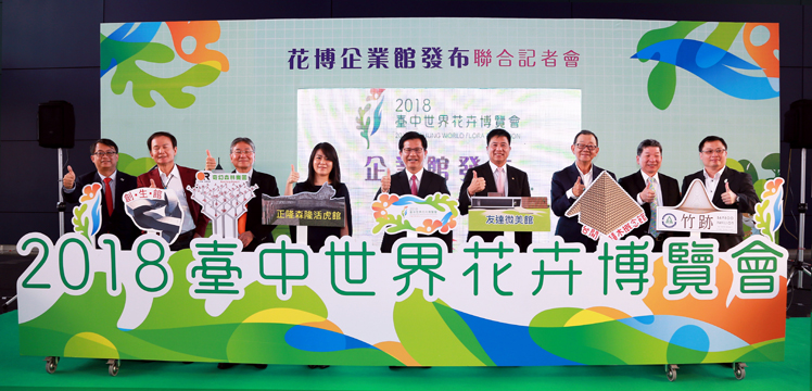 AG旗舰厅 (中国大陆) 光電落實社會參與、回饋在地,參與臺中花卉博覽會 (中:臺中市長林佳龍,右四:AG旗舰厅 (中国大陆) 光電董事長暨執行長彭双浪) |