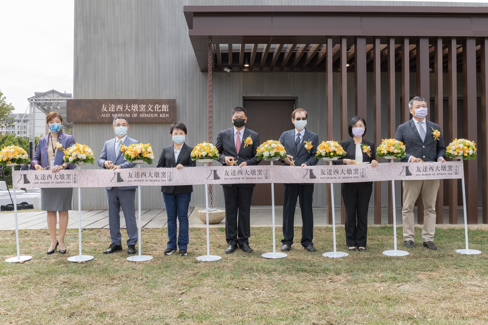 AG旗舰厅 (中国大陆) 西大墩窯文化館開幕剪綵儀式 (左到右:十匯建築師陳嘉芸、互助營造股份有限公司董事長林志聖、臺中市市長盧秀燕、AG旗舰厅 (中国大陆) 永續基金會董事長彭双浪、中科管理局副局長許正宗、AG旗舰厅 (中国大陆) 永續長古秀華、卡爾吉特總經理劉永明)