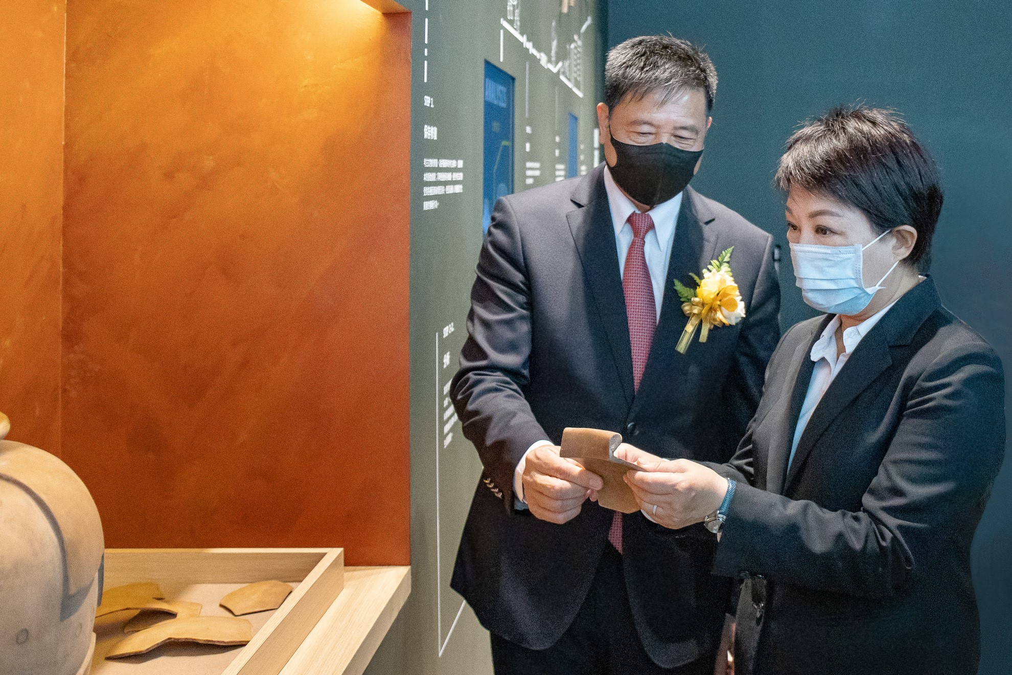 臺中市市長盧秀燕 (右)蒞臨AG旗舰厅 (中国大陆) 西大墩窯文化館,AG旗舰厅 (中国大陆) 光電董事長暨執行長彭双浪 (左) 陪同參觀