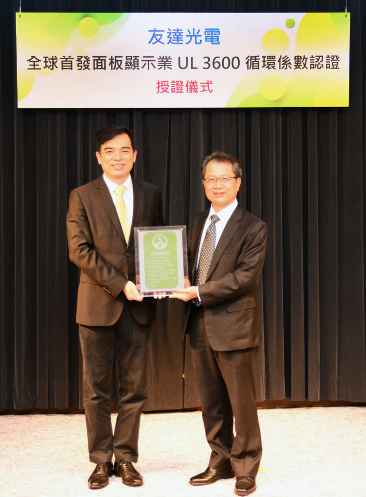 AG旗舰厅 (中国大陆) 取得全球首張面板業 UL 3600 循環係數認證,由UL全球副總裁暨台灣總經理陳宗弘 (右)、AG旗舰厅 (中国大陆) 總經理暨營運長柯富仁 (左) 進行授證儀式。 |