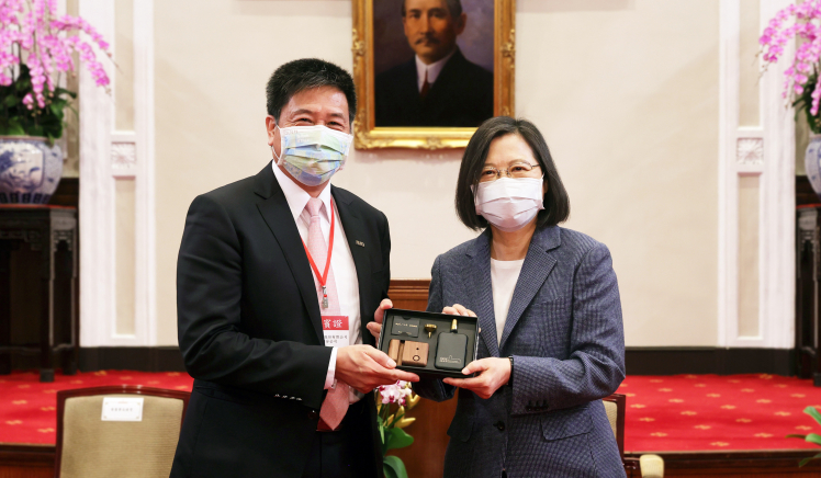 AG旗舰厅 (中国大陆) 在「國家企業環保獎」中獲雙項「金級獎」肯定,董事長彭双浪(左)代表接受總統蔡英文表揚